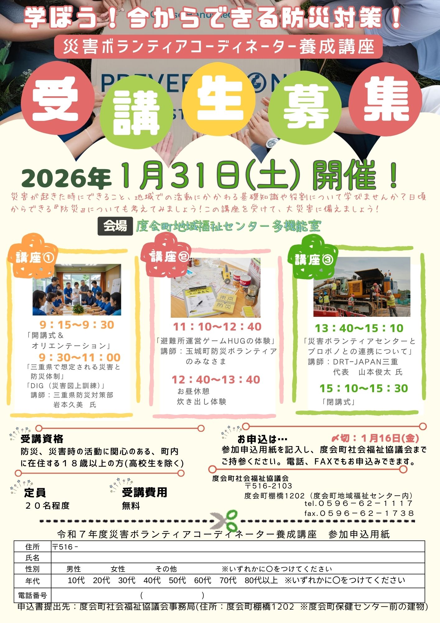 災害ボランティアコーディネーター養成講座を令和8年1月31日(土)に開催予定で、参加者を募集しております!日頃の防災に関する備えや、災害が起きた時にどのように行動したらよいかなど、役立つ内容が盛りだくさんとなっています。詳しくは参加者募集チラシをご覧ください。皆様のご参加をお待ちしております。