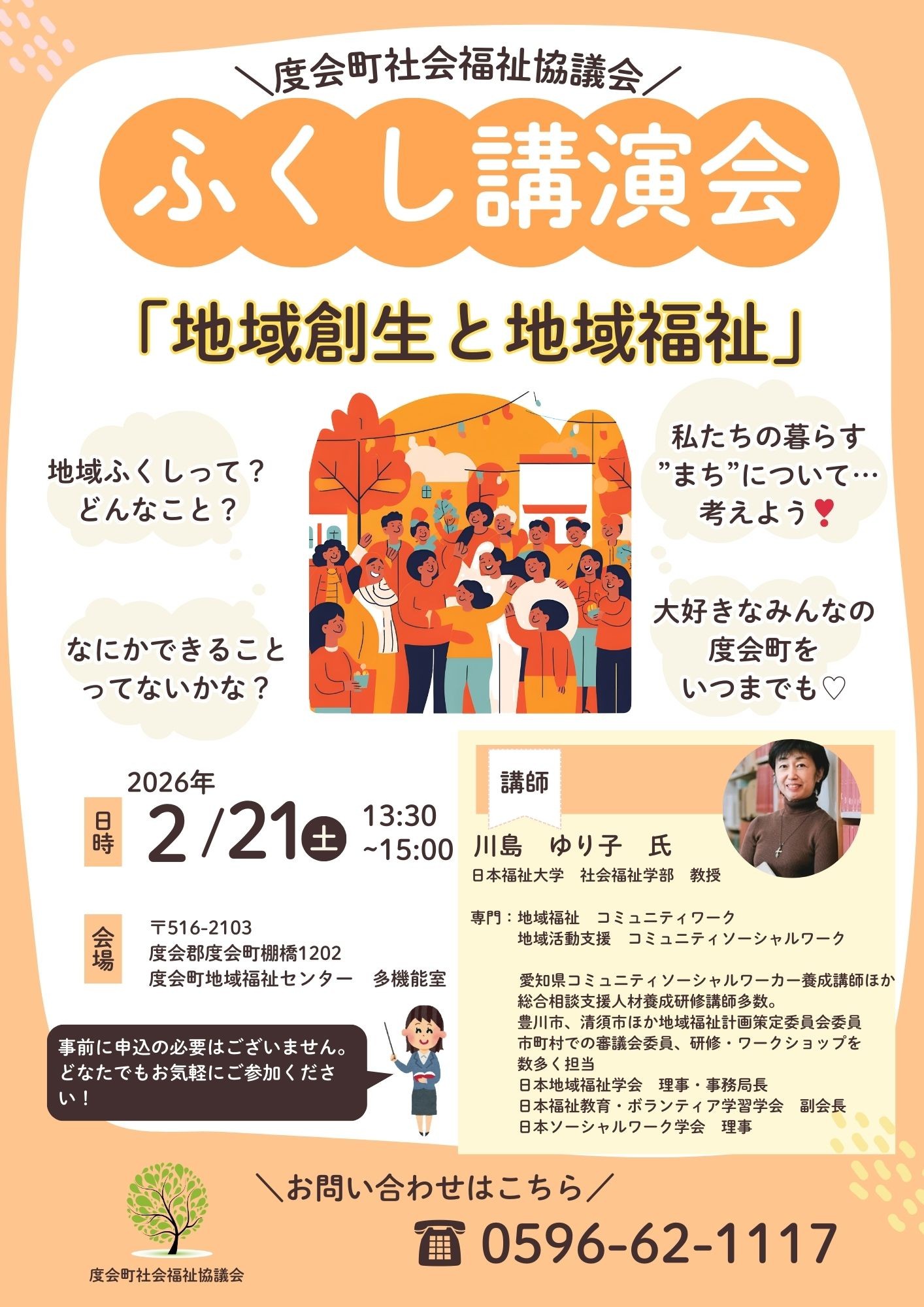 令和8年2月21日(土)13:30~15:00に度会町社会福祉協議会 多機能室にて「福祉講演会」を開催いたします。日本福祉大学 社会福祉学部 教授 川島 ゆり子 氏に「地域創生と地域福祉」という演題で講演していただきます。事前に申込みの必要はございません。どなたでもお気軽にご参加ください。【お問合せ】度会町社会福祉協議会 TEL:0596-62-1117